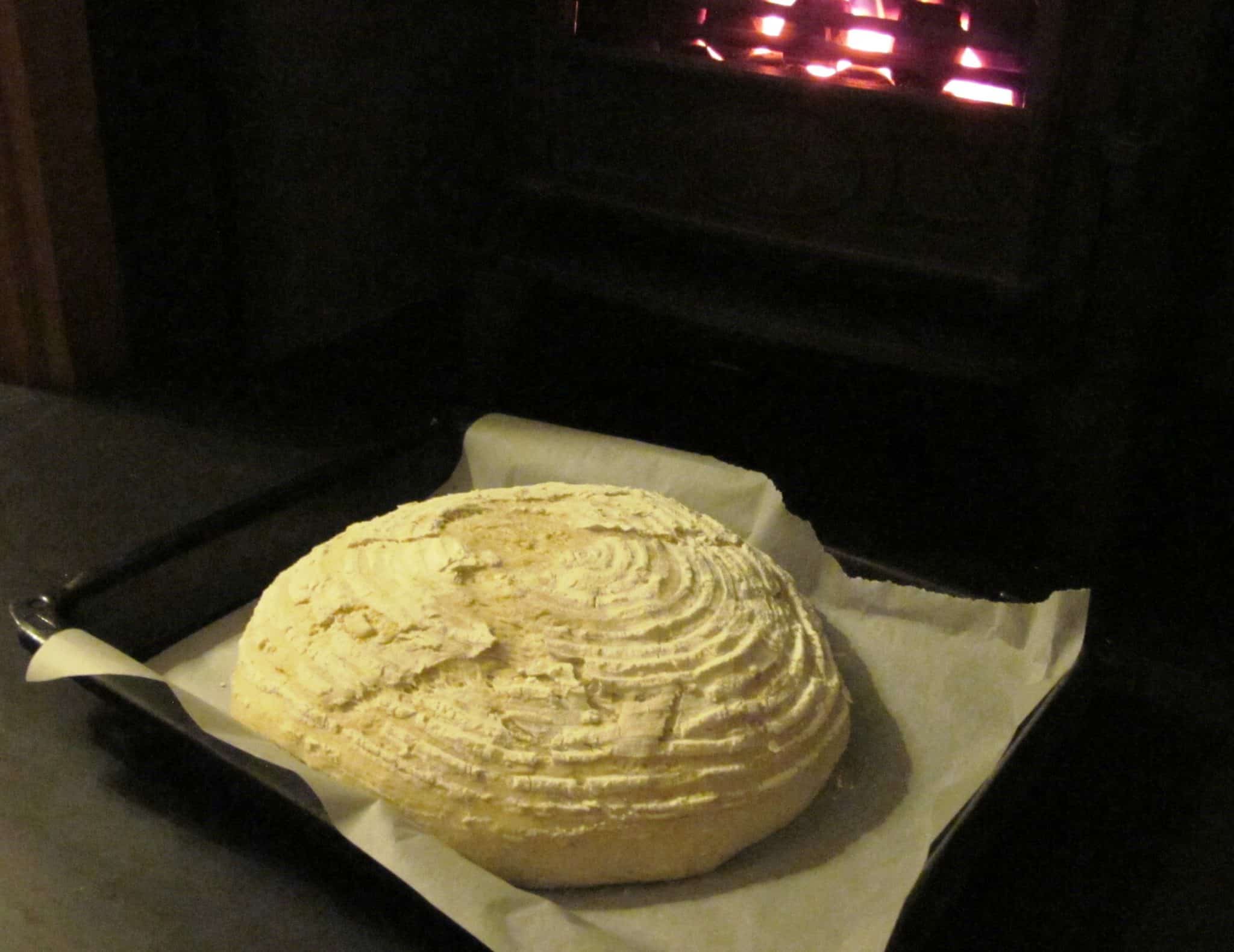 Sourdough bread just turned out onto a baking tray from the proofing basket