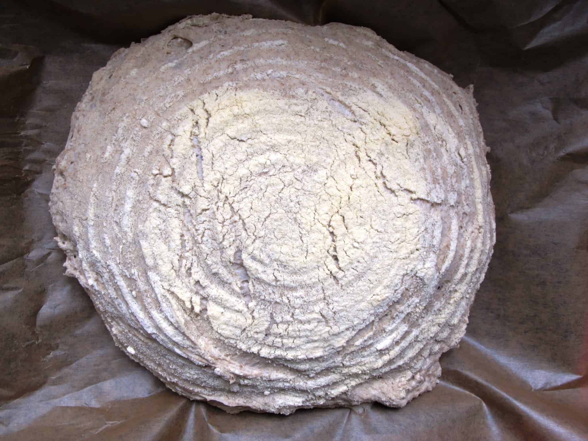 - Flatten and fold again, shape into a boule, then place (seam-side up) in a well floured proofing basket.