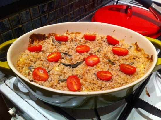 Then simply scatter it on top of your macaroni cheese, and place under a grill or in the oven until it browns. In the picture above, I’ve also added halved cherry tomatoes and some sage leaves to break up the cheesy monotony.